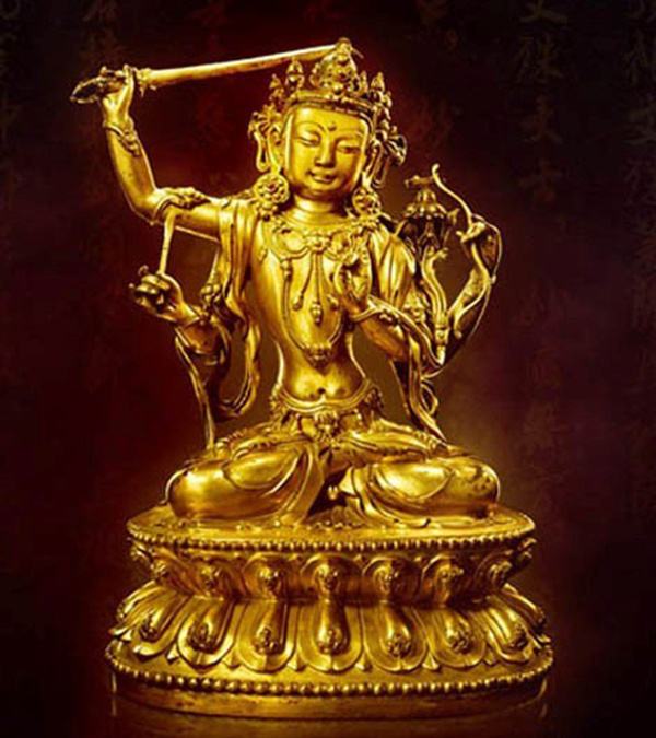 文殊菩萨是佛陀怙恃之一。文殊菩萨又称法王子,为智慧之象征,身紫金色,形如童子,五髻冠其项,右手持金刚宝剑(表示智能之利),能斩群魔,断一切烦恼,左手持青莲花,花上有金刚般若经卷宝,象征所具无上智慧,坐骑为一狮子(表示智能威猛)。