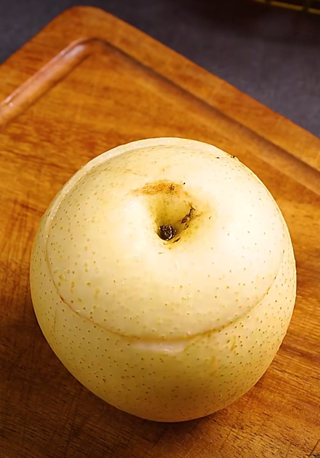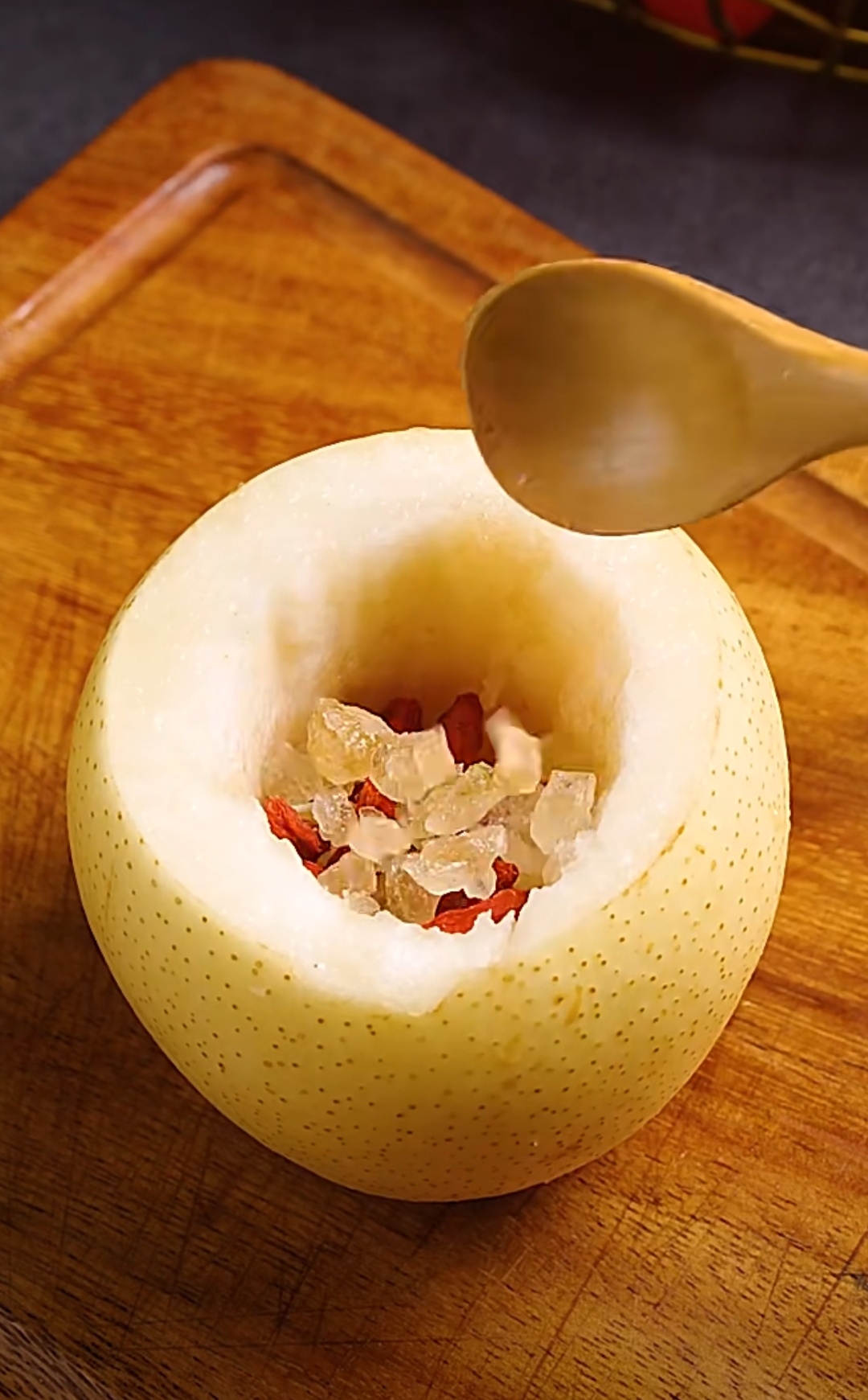 皇冠梨洗干净,到去头,挖出果核,加入适量冰糖!