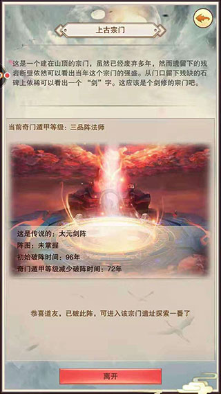 首先在洞天福地探索到第30个福地“不归城”之后你可以花30万零食购买望气仙术之后,然后在背包里使用,可以开启在天音林上古宗门的福地探索。天音林福地探索地图里有一个宗门房子,俗称宗门遗址,找到后在天音林上古宗门会显示出宗门大阵来了。破解宗门大阵后,就能看到紫府开天秘术的购买按钮了,背包里使用,就是那一只猫。破解宗门大阵之后,即可进入先天灵脉挂先天五气了,每一个洞天福地地图都需要破解宗门大阵然后找到宗门遗址。不过最新的版本更新中身外化身已经可以自动找到上古宗门了。