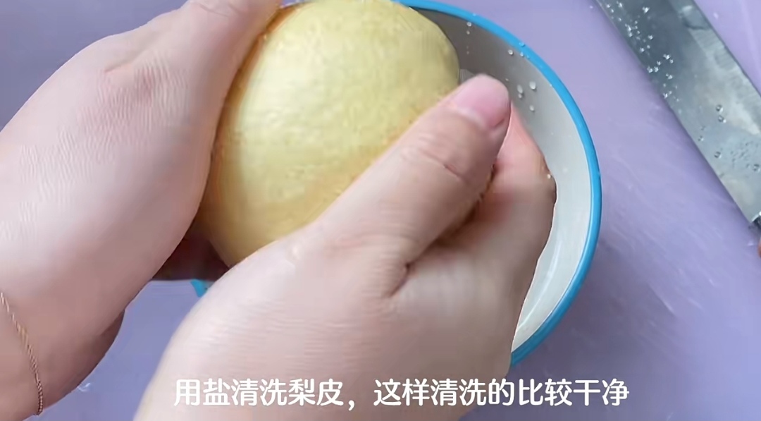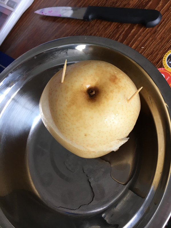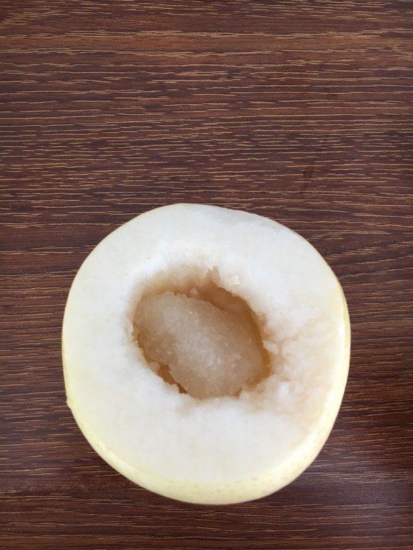 皇冠梨洗干净,到去头,挖出果核,加入适量冰糖!